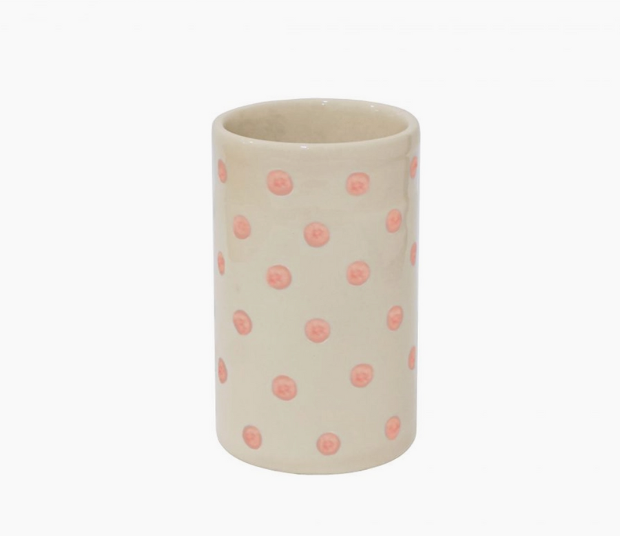 Product Name: Ceramic utensils holder with pink dots 18x11 cm Isabelle Rose Ceramic handmade utensils holder in ivory color with pink dots. *Every utensils holder is different as they are all 100% handmade. Material: ceramic Size: 18x11 cm