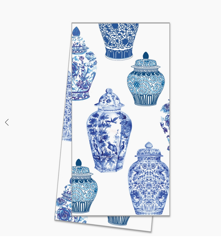 100% cotton and crafted beautifully in Ireland, these towels are sure to make the perfect addition to your kitchen, bathroom, and bar cart. The perfect gift! Darling with a monogram! I could go on and on..... This towel features our new exploaded (gorgeous!) ginger jars pattern. 19"x29" Care Instructions: Wash in cold water with like colors. Tumble dry low and iron on the reverse side for a crisp appearance.