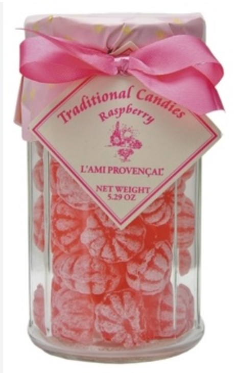 L'Ami Provençal Traditional Candies are a beautiful gift or a sweet treat for yourself. Packaged in a 12-sided glass jar with screw-on lid under the paper wrapper and ribbon. Crafted in the petite and picturesque town of Eguilles, near sunny Aix-en-Provence. Available in Orange-Lemon and Raspberry.