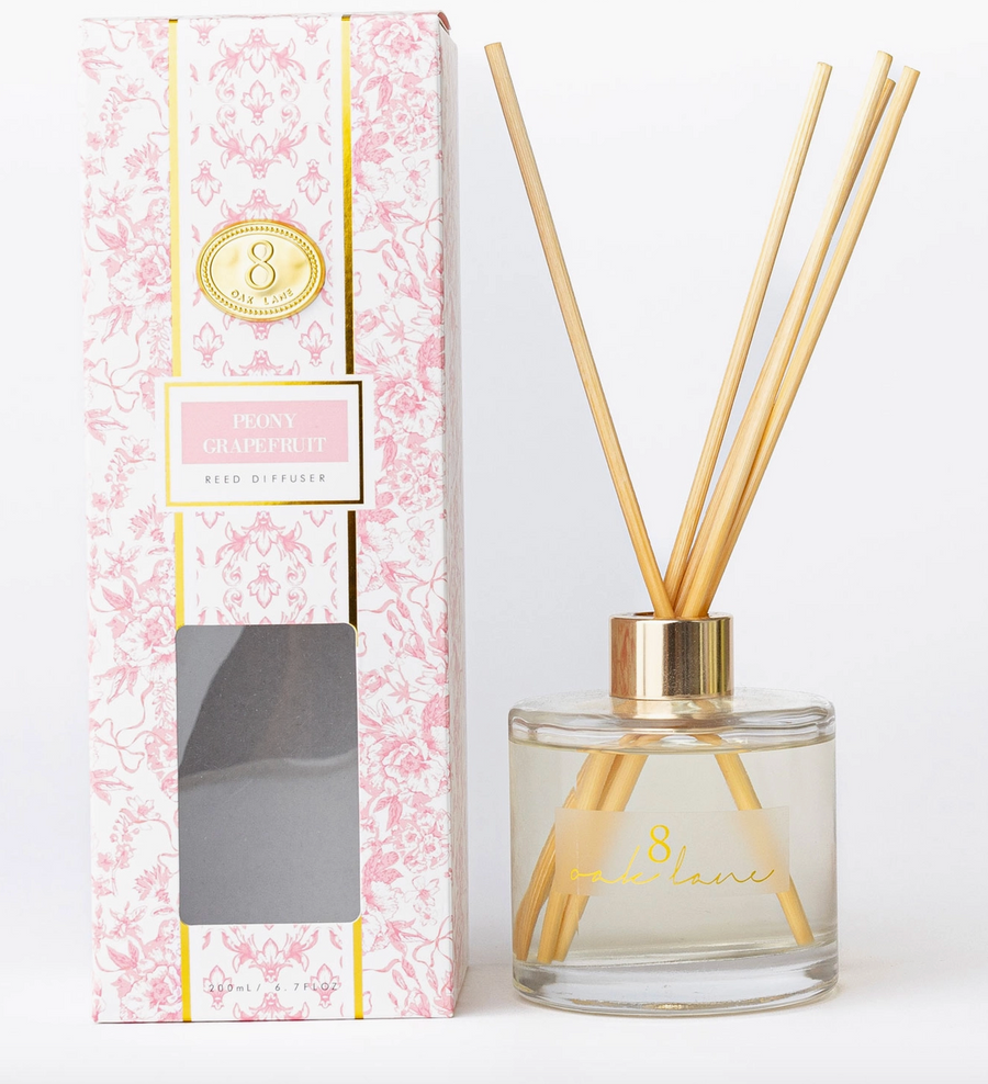 Peony Grapefruit fragrance is a delightful blend of fresh grapefruit, jasmine & blooming peony notes. This divine Reed Diffuser is the perfect companion to infuse your space with a burst of energy, creating an invigorating ambiance that will leave you feeling refreshed and revitalized. This reed diffuser comes with a glass base as well as plenty of reeds and is exquisitely packaged in a stunning box featuring an intricate pink bow toile print, making it an excellent gift.