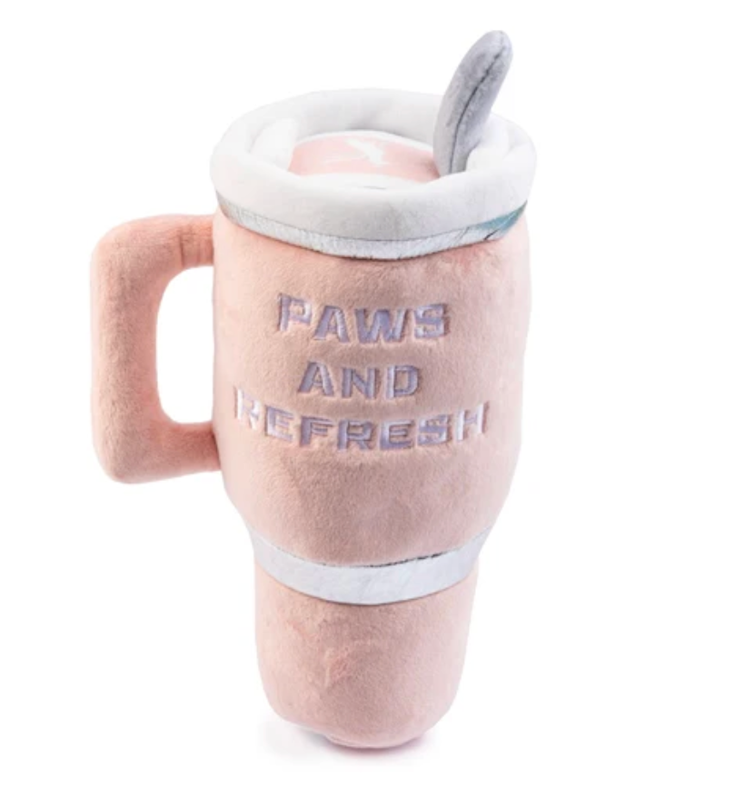 Quench your pup's playtime thirst with our Snuggly Cup, the iconic tumbler! The back proudly reads "Paws and Refresh," offering a delightful twist to the classic cup experience. This plush, squeaky toy ensures your dog stays hydrated with fun, because who says stylish sipping is just for humans? Cheers to tail-wagging refreshment!