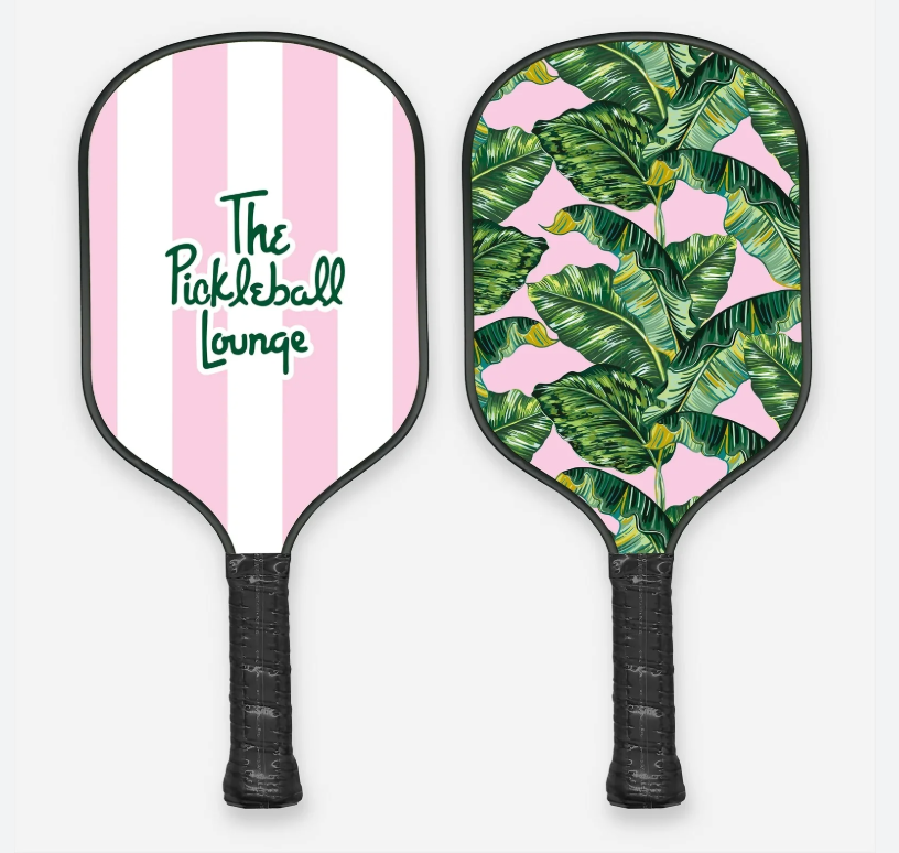 Beverly Hills Hotel design on one side and pink and white stripe on reverse.  A stylish and classy pickle ball paddle for gifting or keeping.