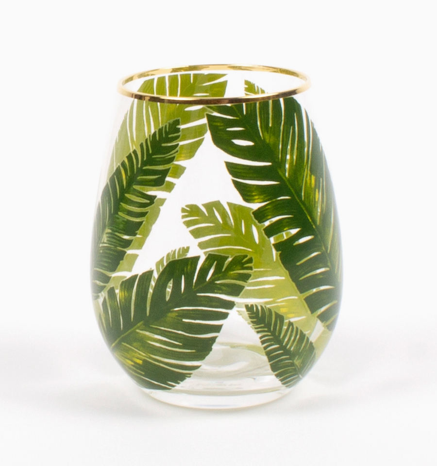 Immerse yourself in paradise right at home with the Banana Leaf Stemless Wine Glass. This stunning piece offers a sophisticated touch of tropical charm to any occasion. Crafted with exquisite attention to detail, this beautiful wine glass holds up to 20 ounces of your favorite beverage and is adorned with a gold rimmed edge. Anticipate a luxurious drinking experience with this elegant stemless design measuring 3.5" x 4.5". This timeless piece was designed in the USA before being imported for your pleasure and should be hand washed to protect its delicate artistry. Enjoy the exotic flavor of a staycation whenever you please with the Banana Leaf Stemless Wine Glass.
